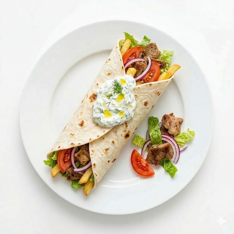 Gyros im warmen Fladenbrot mit Salat, Tomaten, Zwiebeln und Tzatziki.